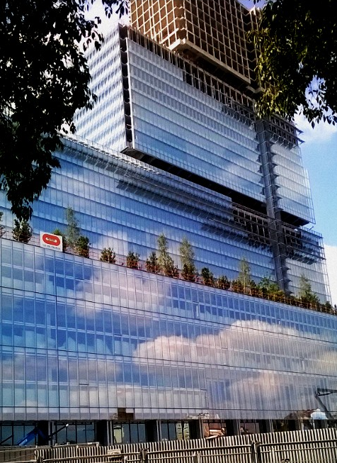 Débuté à l’été 2014, ce chantier hors normes avance à grands pas. Les façades double peau recouvrent quasi entièrement cet ouvrage de 160 mètres de hauteur.