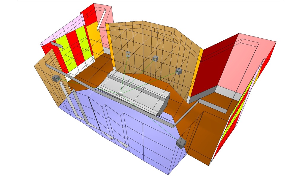 Cette cabine multicanal (format 5.0 - 5.1 et 5.2) a été dimensionnée par Lamoureux Acoustics (isolement via boîte dans la boîte avec plancher à ressorts - Les cinq HP ont été encastrés dans les parois et deux caissons de basse au sol, la réponse acoustique de la cabine respecte les recommandations de l’AES TD1001.0.01-10). La réponse de la cabine a été simulée via logiciel acoustique prévisionnel avant réalisation.